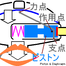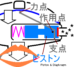2. バルブシートの表面が凹むと、その分 ピストン(作用点)はオリフィス側に移動する《→》ので、連動するデマンドレバー(力点)は 『ダイアフラム側に移動します《↑》』。